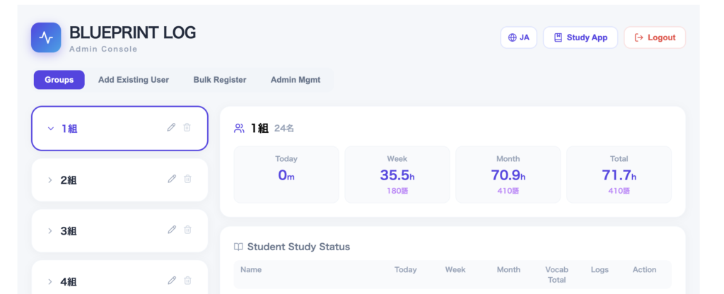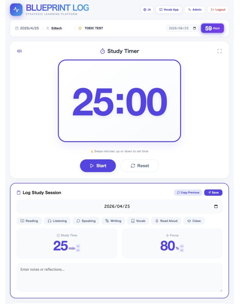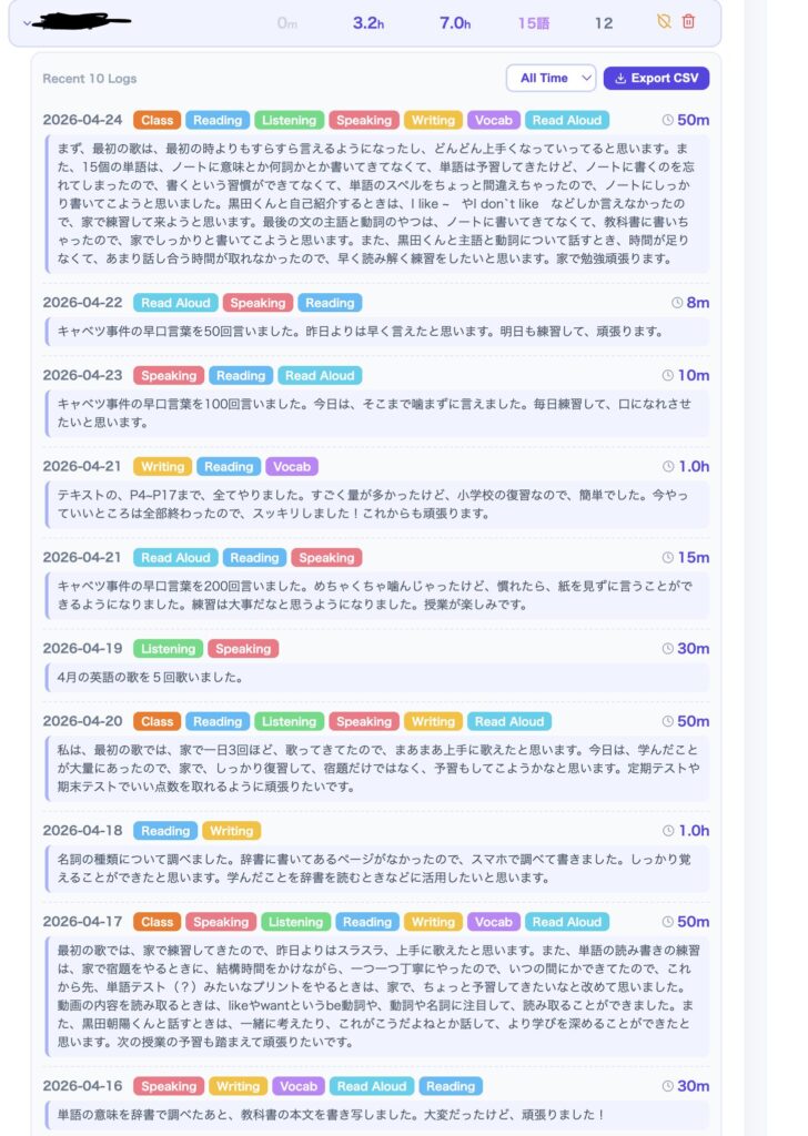 Daily use: Students log their English study at home. It takes about 60 seconds. Some students start with minimal reflections ("I studied vocab"), but over weeks, their reflections become richer ("I tried reading a news article without a dictionary and understood about 60% — I need to focus more on guessing meaning from context").