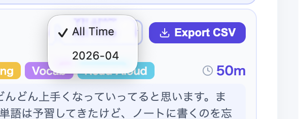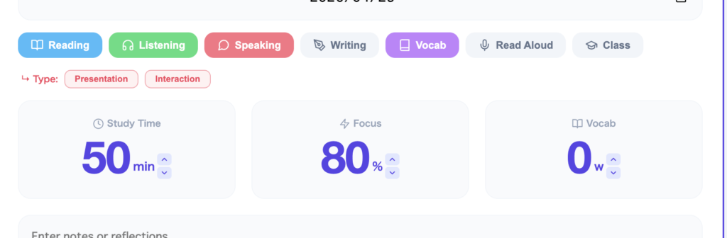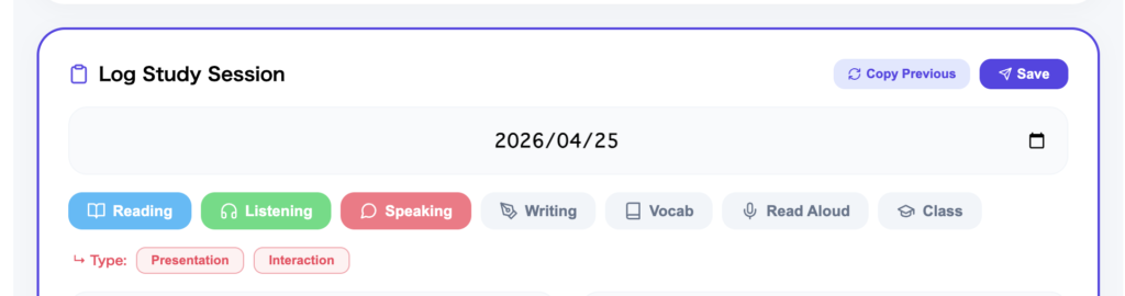 By making this distinction in the logging interface, the app teaches students to think about speaking practice with more nuance. A student preparing for a speech competition needs presentation practice. A student who freezes in conversation needs interaction practice. These are different problems requiring different strategies, and the app's category system makes that difference explicit.