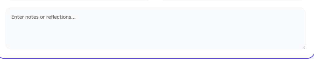 What makes this particularly effective is its positioning. The reflection prompt appears after the student has already selected their skill categories and rated their focus — by the time they reach the reflection field, they're already in a metacognitive mindset. The app scaffolds their thinking process.