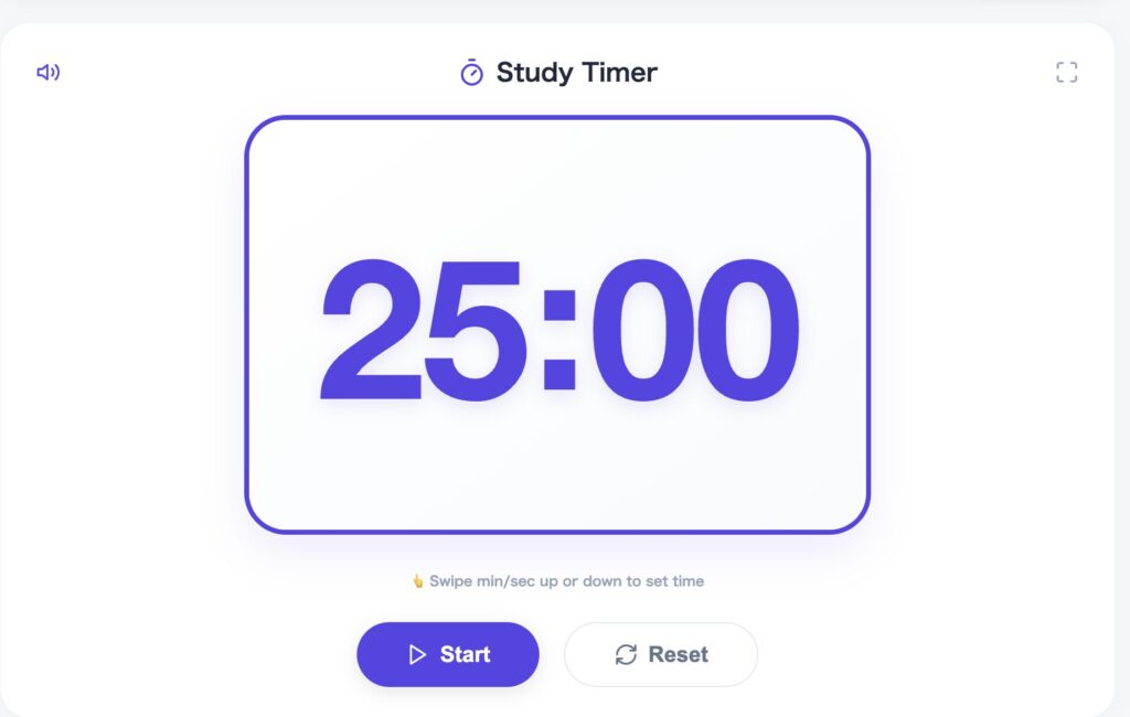 The Pomodoro-style timer (default: 25 minutes) lets students set intentional study durations. The drag-to-adjust interface makes planning feel tangible and deliberate.