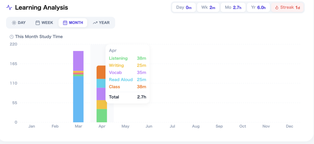 Four timeframe views — Day, Week, Month, and Year — allow students to evaluate their learning at different granularities. Daily views help with immediate reflection ("Did I study what I planned today?"). Weekly views reveal patterns ("I always skip speaking practice on weekdays"). Monthly views show trends ("My total hours are increasing"). Yearly views provide the big picture ("I've studied 340 hours this year across all seven skills").